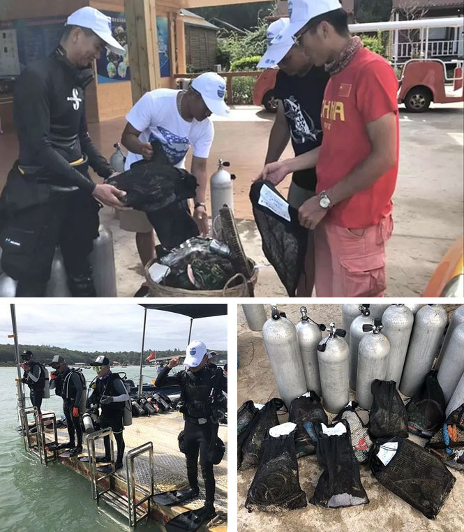 當天下午,潿洲島探索潛水、小丑魚潛水、火山島潛水、深呼吸潛水等多家潛水公司還組織了潛水員,迎著西南浪,克服高溫、勞動強度大等困難,對潿洲島附近海域海底廢棄漁網(wǎng)和海洋垃圾進行清理,共清理海底垃圾24.3公斤。