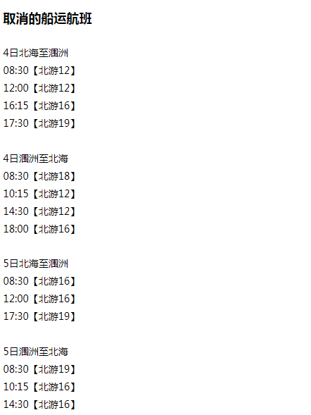 通知:7月4日、5日北海-潿洲島航線高速船航班停航