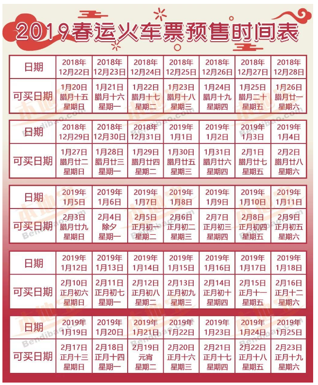 2019年1月5日,可以購買2019年年二十九(2月3日)的火車票。