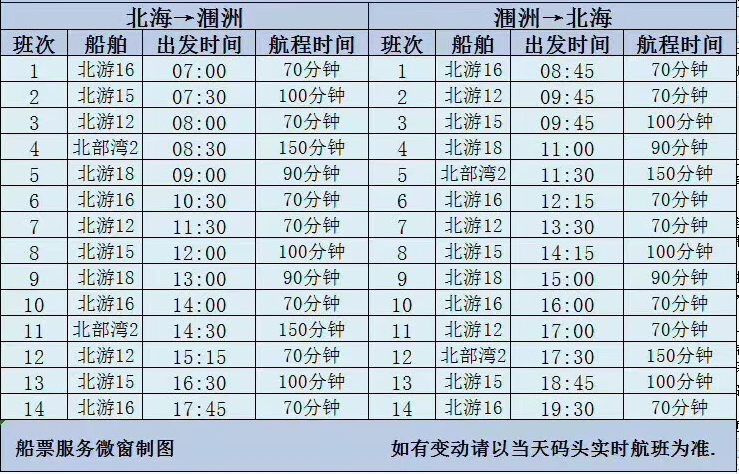 北海往返潿洲島的小快船有北游8號、北游18、北游19、北游28、飛達和飛逸1號,載客量在300-400人,航行時間在60-90分鐘,也有三種艙位選擇,分別為普通艙、商務艙和特等艙