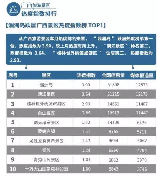 廣西旅游行業(yè)數(shù)據(jù)報(bào)告及排行中所指網(wǎng)絡(luò)傳播熱度指數(shù),是指在從新聞媒體、微博、微信、客戶端、網(wǎng)站、論壇等互聯(lián)網(wǎng)平臺(tái)采集海量信息的基礎(chǔ)上,提取指定事件、人物、品牌、地域等相關(guān)信息,并對(duì)所提取的信息進(jìn)行標(biāo)準(zhǔn)化計(jì)算后,得出的能反映其在網(wǎng)絡(luò)上受關(guān)注度的指數(shù);熱度值所呈現(xiàn)的數(shù)值為0-100,數(shù)值越大,表明其網(wǎng)絡(luò)受關(guān)注度越高。