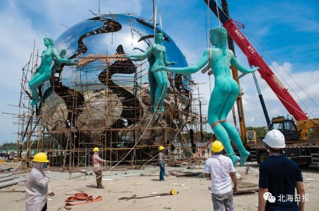 今年2月20日舊“潮”雕塑正式拆除重建,項(xiàng)目進(jìn)入全面實(shí)施階段。截至8月中旬已基本完成新雕塑球體和新基座重建工作,目前正進(jìn)行打磨拋光新球體焊縫的工作。重建后的新雕塑球體直徑仍然保持20米不變,材料選用目前國(guó)際高標(biāo)準(zhǔn)的316L型不銹鋼,采用全新的沖壓成型技術(shù)制作,內(nèi)部結(jié)構(gòu)也已全部更換為304型不銹鋼結(jié)構(gòu)重新安裝。為防海風(fēng)侵蝕,雕塑上環(huán)繞著的7位美麗采珠少女采用青銅材質(zhì)。
