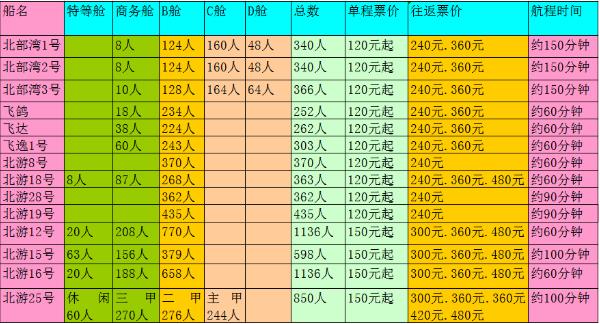 飛達(dá),飛逸1號,北游18:A等艙(位于二樓)180元/人,B等艙(位于一樓)120/人,特等艙240元/人