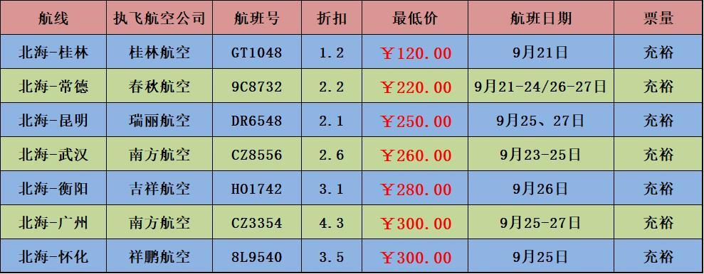 北海到全國各地飛機票低到120元,國慶前趕緊走起