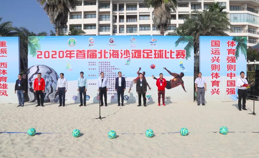11月3日下午,2020年首屆北海沙灘足球比賽開幕儀式在我市僑港海濱浴場舉行。中國足協(xié)社會足球部部長李久全,自治區(qū)體育局黨組副書記、副局長、廣西足協(xié)主席謝強,市政府副市長歐余軍,市政協(xié)副主席、市足協(xié)顧問葉宗沛,國家沙灘足球隊領(lǐng)隊付玉培,廣西足協(xié)常務(wù)副主席龐東霞,市旅游文體局黨組書記李才能,市旅游文體局副局長梁吉棉,銀海區(qū)副區(qū)長王道波,廣西足協(xié)副主席、市足協(xié)主席李勝遠等領(lǐng)導(dǎo)嘉賓出席開幕式;組委會各成員單位的領(lǐng)導(dǎo),裁判員和各參賽隊伍的領(lǐng)隊、教練員、運動員,新聞媒體,以及市體育運動學(xué)校、區(qū)市共建水上項目和社會各界群眾約500人參加開幕式。