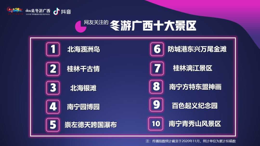11月19日,“dou來冬游廣西——2020冬游廣西傳播指數(shù)發(fā)布暨文旅創(chuàng)作者論壇”在南寧舉行。發(fā)布會針對2020冬游廣西傳播指數(shù)進行了解讀,結(jié)合2020冬游廣西“C位”關(guān)鍵詞,生動展現(xiàn)了“廣西文旅”的抖音畫像,也為游客提供了更加精準的冬游廣西向?qū)А?br />
