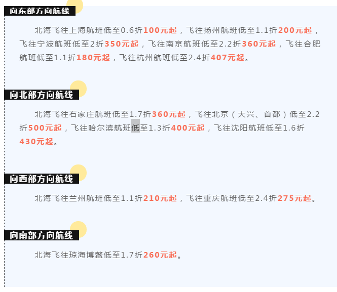 近來,在北海機(jī)場投入運(yùn)力的航空公司結(jié)合冬季"候鳥”人群探親訪友往來密切的特點(diǎn),紛紛推出了航空出行優(yōu)惠票價(jià),特別為北海市民元旦假日出行加大了優(yōu)惠力度,讓機(jī)票價(jià)格更親民!南方航空、春秋航空、國際航空、吉祥航空等多家航空公司為回饋廣大市民,方便市民旅游、探親和返家,截止至12月末部分航線在年末放出今年以來最優(yōu)惠票價(jià)。(以下機(jī)票價(jià)格均不含民航發(fā)展基金稅)北海機(jī)場溫馨提醒