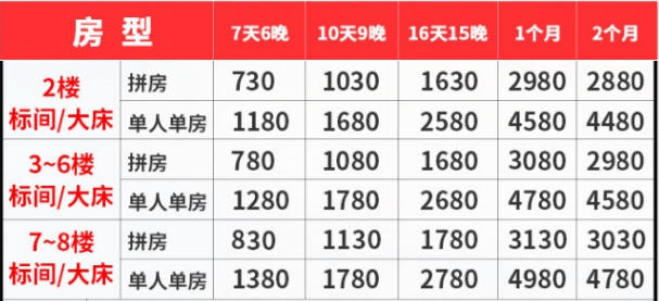 5.入住30天以上如遇到春節(jié)(初一至初四),則另加收300元/間/1晚,住滿60天逢遇春節(jié)則另加收200元/間/1晚,住滿90天以上則春節(jié)不另加價(jià)。住滿一個(gè)月的年三十免費(fèi)使用年夜飯。