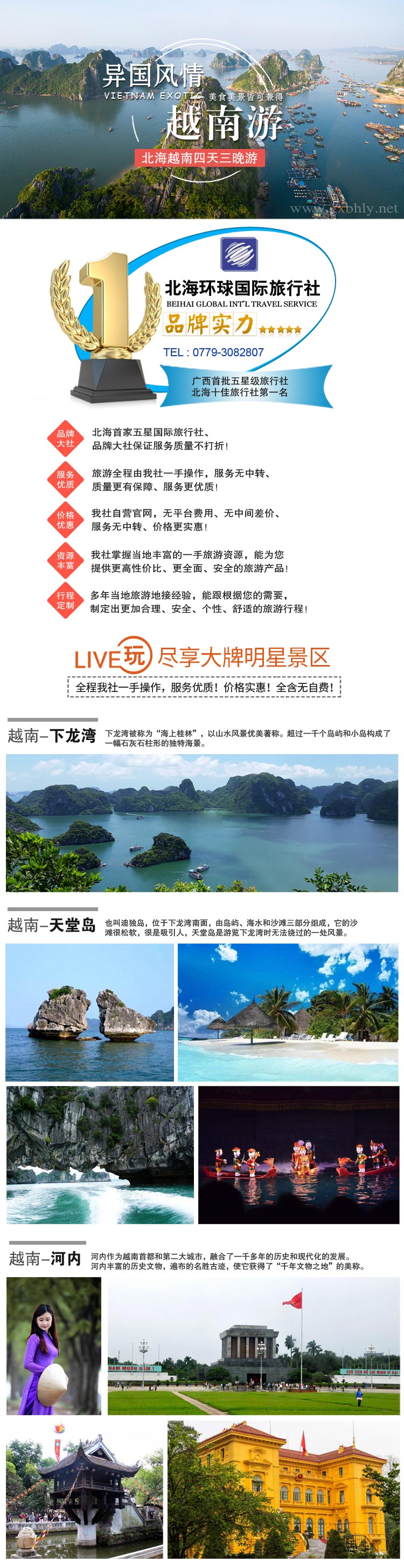4、景點(diǎn):行程中所列景點(diǎn)首道門(mén)票;特別聲明:行程中“印象越南表演、 天堂島、月亮湖、迷宮、巡州島”均為我社特別贈(zèng)送項(xiàng)目,如不可抗力因素不能游覽或游客不參與游覽,亦無(wú)費(fèi)用減退
