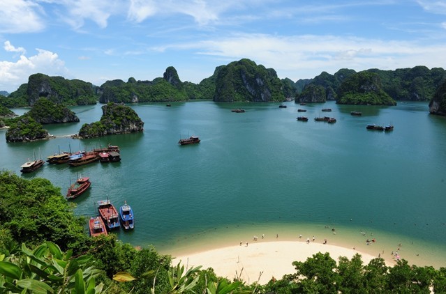 早餐后乘越南特色紅木游船,倘佯于萬頃碧波之中。漫游被國(guó)際教科文組織評(píng)為世界自然遺產(chǎn)之一的“海上桂林”——下龍灣(游覽時(shí)間約4H)(在1500多平方公里的海面上、聳立著3600多座大小不一、千姿百態(tài)的喀斯特地貌的山石、更以其“海美、山幽、洞奇”三絕而享譽(yù)天下)、斗雞島、狼狗石、香爐山、天宮洞等、數(shù)不勝數(shù)的風(fēng)景盡收眼底、下龍灣亦有小漁船如影相隨,可向漁民就地購(gòu)買些許剛打撈而起的各種魚、蝦、蟹等美味海鮮,讓游船廚工加工費(fèi)(15%)烹飪。