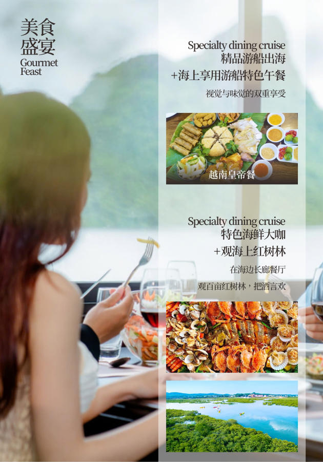 3.用餐:全程用餐7正3早餐,5正*餐標(biāo)30元/正+1正特色海鮮大咖+1正越南特色皇帝宴
