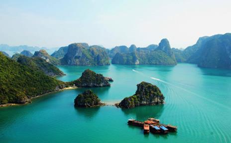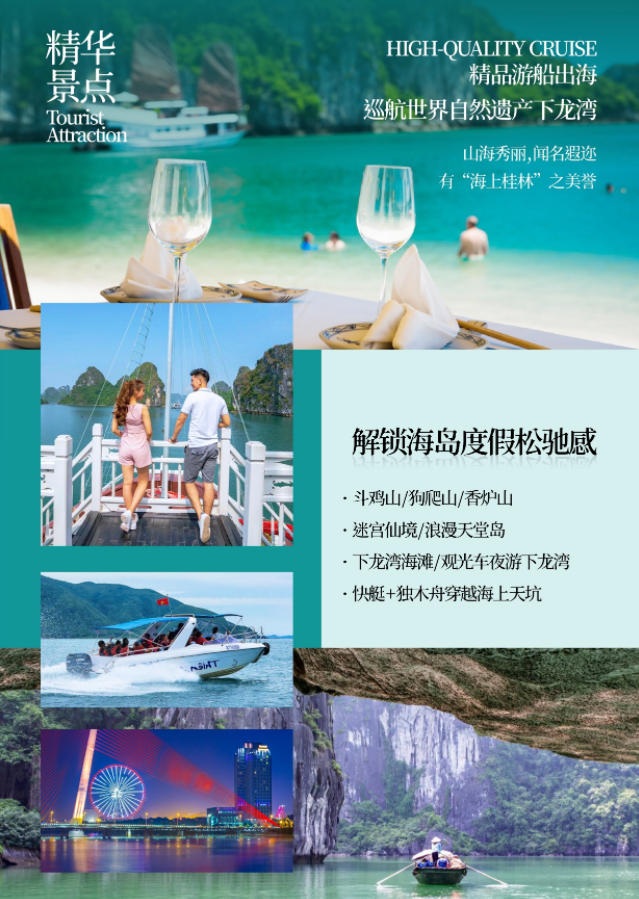 早餐后,乘車前往巡州島度假區(qū)、欣賞海岸風(fēng)光 , 后乘越南特色紅木游船漫游世界八大自然遺產(chǎn)之一的“海漫游世界八大自然遺產(chǎn)之一的“海上桂林” —下龍灣 (游覽時間約 4H) (在 1500 多平方公里的海面上、聳立著 3600 多座大小不一、千姿百態(tài)的喀斯特地貌的山石、更以其“海美、山幽、洞奇”三絕而享譽(yù)天下) ——觀狗爬山、香爐山、 斗雞山等數(shù)不勝數(shù)的風(fēng)景盡收眼底,再從斗雞石出發(fā)游覽下龍灣的精華景點(diǎn)之一【迷宮仙境】。午餐安排于船上進(jìn)行用餐,下龍灣亦有小漁船如影相隨,把酒臨風(fēng),去國懷鄉(xiāng)之憂蕩然無存,在天海一色中的游船上大快朵頤的美妙感覺在您的全身悄悄蔓延。午餐后乘坐【快艇】前往【海上天坑】,抵達(dá)洞口后換成小木船進(jìn)入洞內(nèi) ,海上天坑是一個 360 度皆為垂直絕壁的封閉海灣 ,空靈幽閉。湖水清澈見底 ,水平如鏡,在四面高聳徒峭山崖的環(huán)抱中,仿佛給人一種與世隔絕的感覺。游完后前往越南最浪漫、最漂亮的島嶼—【天堂島】, 島上活動 1-2 小時。細(xì)白的沙灘上可以玩各種沙灘游戲 (游戲道具自備) ,在指定區(qū)域還可以游泳,登上島嶼的山頂俯視下龍灣海上桂林全景,拍攝您心意的美照,隨后坐船返回碼頭下船 ,告別上帝賜于越南最好的禮物-下龍灣。