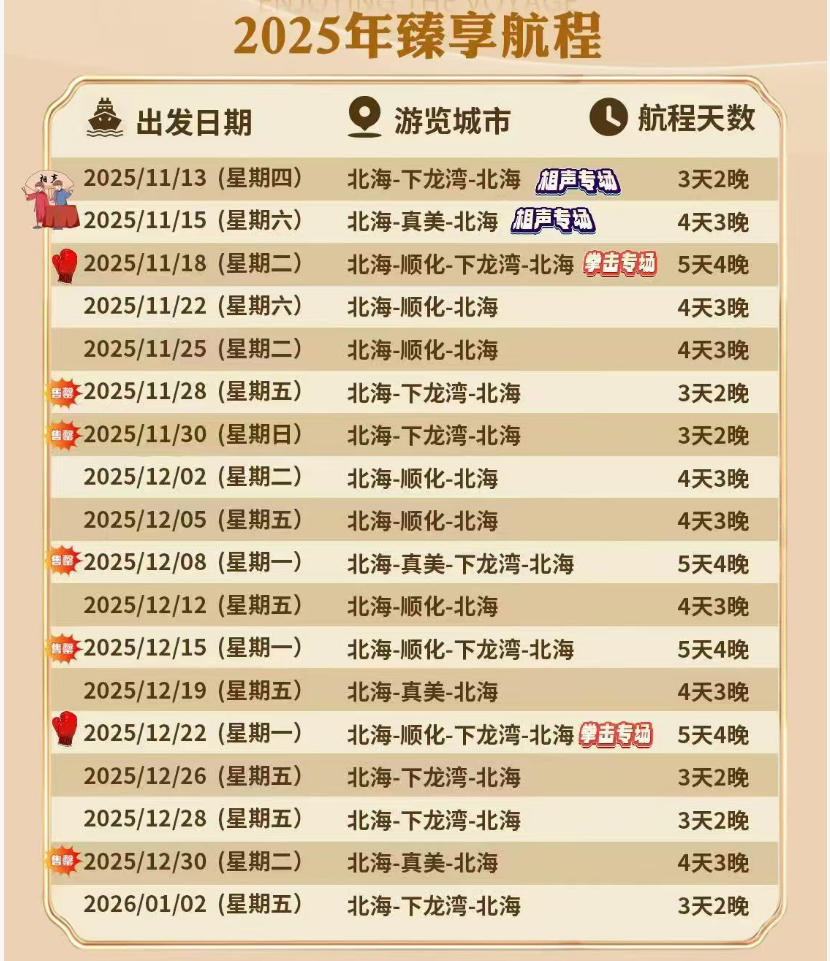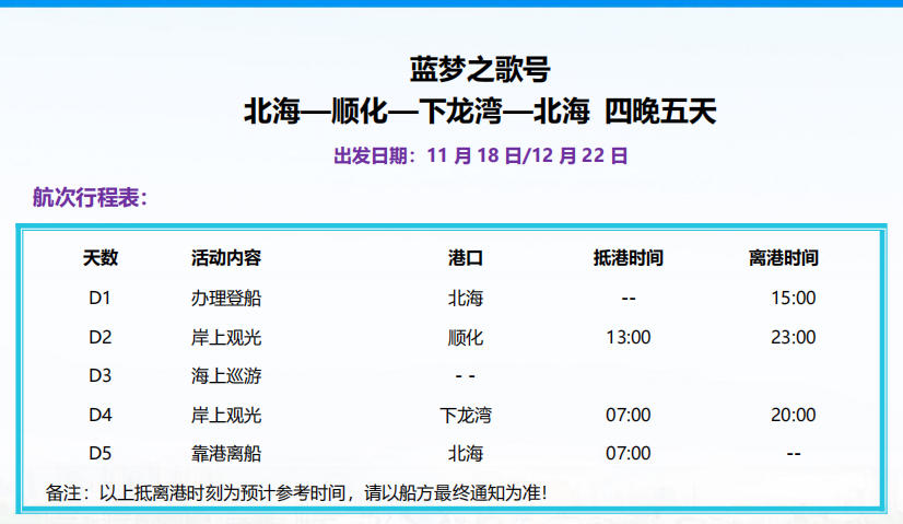 5、以上行程的靠岸及離岸時(shí)間均為參考時(shí)間,根據(jù)實(shí)際情況可能會(huì)有所改動(dòng),具體以通知書(shū)為準(zhǔn),請(qǐng)務(wù)必留意日?qǐng)?bào)最晚回船時(shí)間,合理安排岸上游覽行程,以免錯(cuò)過(guò)登船。