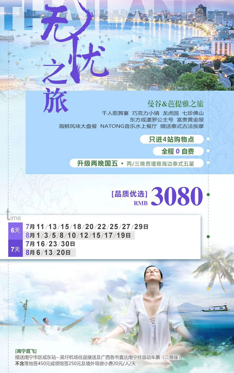 1.南寧-曼谷往返國際機(jī)票、機(jī)場稅、保安稅、燃油附加費(fèi)(游客一旦簽訂合同,機(jī)票全款已支付航空公司,機(jī)票不得改簽和退票,否則將承擔(dān)機(jī)票全額損失。