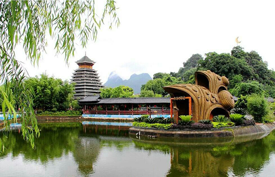 夢(mèng)幻歌圩:以展示苗族風(fēng)情為主題,可以觀賞到極具特色的苗家吊腳樓、古老的銅鼓、奇特的苗族圖騰柱,親臨其境地領(lǐng)略到苗族神秘的圖騰文化、銅鼓文化和苗家風(fēng)情。