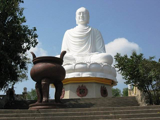 一座中國式佛寺,建筑上的龍形馬賽克是由琉璃和陶瓷瓦片裝飾而成的。這座塔寺始建于19世紀(jì),至今寺中還住著和尚。在寺后的山上,有一尊全鎮(zhèn)都看得見的巨大的石觀音雕像。從山上可以俯瞰整個芽莊市區(qū)和海濱。山下東面北面的椰林茂密。風(fēng)光自然而原始,夕陽之下越益迷人。