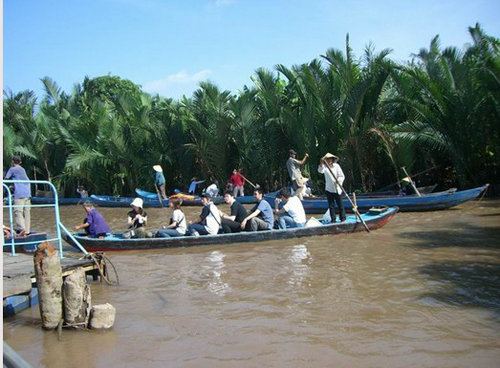美拖的一絕是水果島,島就在湄公河的中央。從美拖的碼頭上船,10分鐘就到島邊,在這里換上越南船民的小船,沿著曲曲彎彎的河汊劃上二十幾分鐘,其實(shí)是在島間兜了個(gè)圈子,只是為了讓大家感受一下湄公河的景色和水椰子的迷人。每條船上一般有兩位船民劃船,一個(gè)船頭,一個(gè)船尾。他們沒有別的收入,只是靠游客給的小費(fèi)生活。他們絕不會(huì)主動(dòng)找客人要小費(fèi),小費(fèi)的數(shù)量也完全隨意,我甚至看到有的客人下船后揚(yáng)長(zhǎng)而去,他們兩人也只是默默地對(duì)視一眼,然后默默地劃開去接另一批客人。